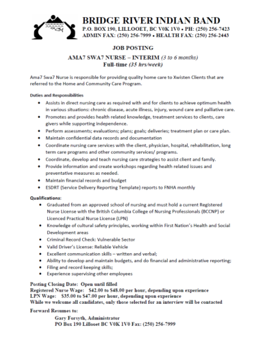 Ama7 Swa7 Nurse – Interim Job Description:JOB POSTING – Ama7 Swa7 Nurse Interim – Deadline 2025 Open till Filled Back to jobs
