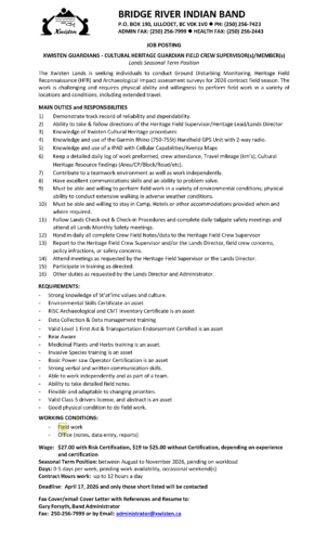 Xwisten Guardians – Cultural Heritage Guardian Field Crew Supervisor(s)/Member(s)